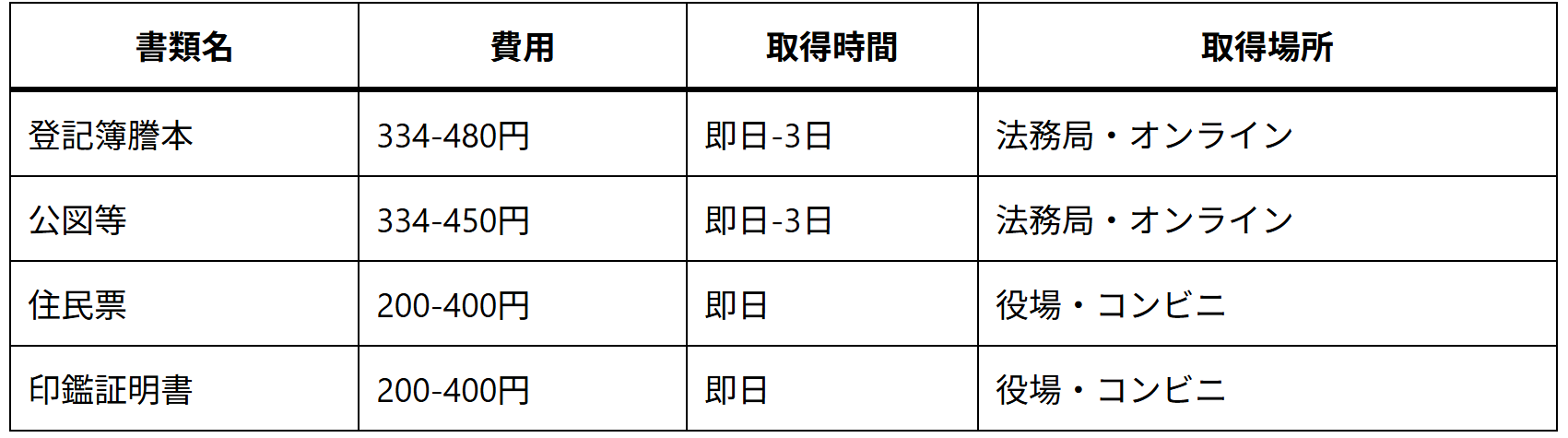 全書類の取得費用は合計3,000-5,000円程度で、時間は最短1日、最長2週間程度を見込んでおくことが重要です。